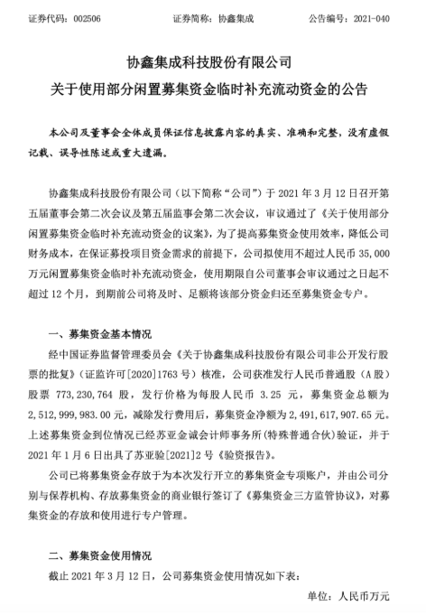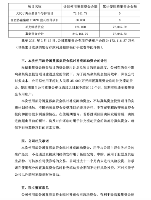 3月13日,協鑫集成發布關于使用部分閑置募集資金臨時補充流動資金的公告,公告稱擬募集資金約25億元,其中7.3億元用于投資大尺寸再生晶圓半導體項目,5億元用于投資合肥協鑫集成 2.5GW 疊瓦組件項目,其余用于補充流動資金。