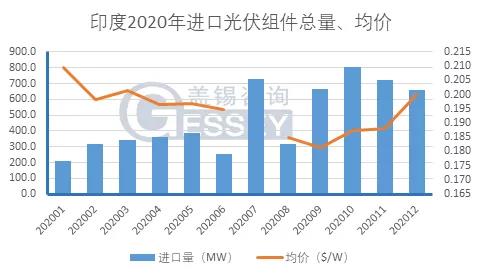 蓋錫咨詢(“GESSEY”),作為權威的全球新能源咨詢平臺,長期致力于新能源市場數(shù)據(jù)的收集、分析、反饋,提供及時有效準確的太陽能光伏行業(yè)資訊。其最新報告顯示,2020年,印度全年進口光伏組件5.7GW,其中12月進口總量656.7MW,12月進口均價0.200$/W。