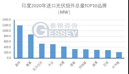 根據(jù)報告數(shù)據(jù),2020全年,在印度流通光伏組件品牌以全球知名光伏組件品牌為主。其中,晶科、隆基、東方日升、天合、尚德位列印度全年進口光伏組件總量TOP5。晉能、阿特斯、晶澳、正信、中節(jié)能處于印度光伏組件出貨量第二梯隊,分列6至10名。TOP10企業(yè)占印度全年組件進口總量的87%,頭部效應顯著。