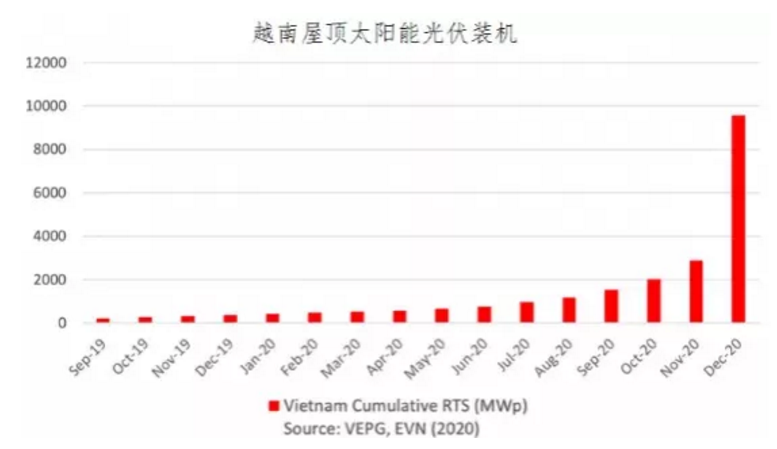 2020年底,越南累計光伏裝機已達到16.5GW,新增光伏裝機10.5GW,成為全球第三大光伏市場(中國市場48.2GW,美國市場19GW)。其中越南屋頂太陽能安裝量爆炸式猛增,全年新增屋頂光伏裝機超過9GW,10.2萬戶,裝機量增長了2435%。
