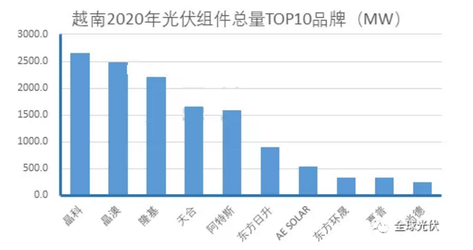 2020全年,在越南流通光伏組件品牌以全球知名光伏組件品牌為主,TOP10企業占越南全年組件進口總量的88%。其中,晶科、晶澳、隆基、天合、阿特斯位列越南全年進口光伏組件總量TOP5。天合、晶澳、阿特斯均在越南建有工廠。