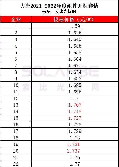 從投標情況來看,組件型號440W以上占比30%,530W以上占比70%,單雙玻比例4:6。共有22家企業(yè)參與投標,投標詳情如下: