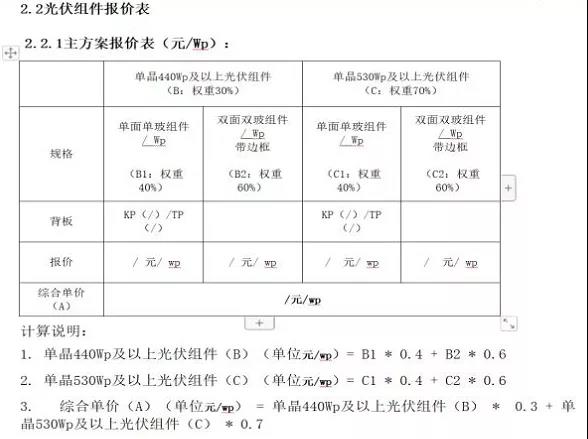 而本次光伏組件評標主要從光伏組件轉(zhuǎn)化效率、衰減率、環(huán)境適應(yīng)性、運維費用、業(yè)績、供貨能力、服務(wù)水平、備件及專用工具等進行全壽命周期的綜合評價。組件投標綜合單價(A)(單位元/wp)=單晶440Wp及以上光伏組件(B)*0.3 + 單晶530Wp及以上光伏組件(C)* 0.7。