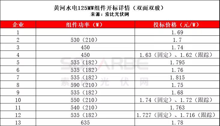 從投標價格來看(報價含1000公里運費),半數(shù)企業(yè)投標價格在1.7元/W以上,且大部分為一線廠商(上表標紅)。其中,企業(yè)1報價最低為1.59元/W,投標組件型號為440W單面組件。