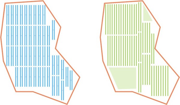 安捷1P雙排設計使支架長度只有72米提升支架結(jié)構(gòu)的穩(wěn)定性,實現(xiàn)相同面積更高的裝機容量,最多可裝120塊組件。在相同面積下,安捷1P裝機量提高達15.6% (見下圖)。