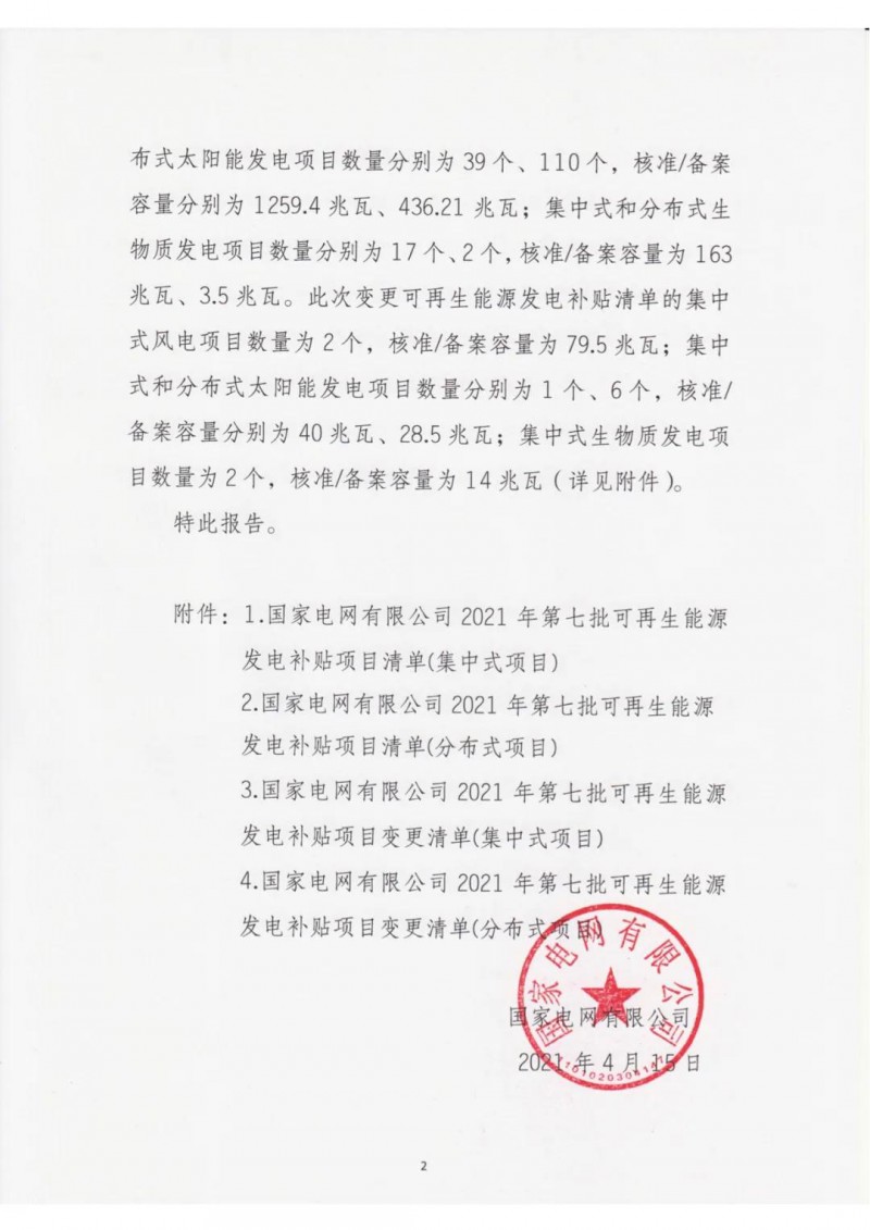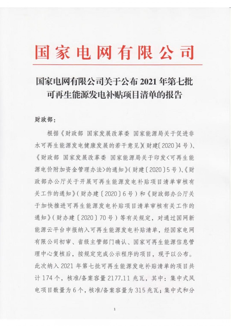 2021年4月15日,我公司已將完成公示的2021年第七批可再生能源發(fā)電項目補貼項目清單上報國家主管部門,第七批項目清單及后續(xù)項目審核進(jìn)展情況,請登錄新能源云平臺查詢。