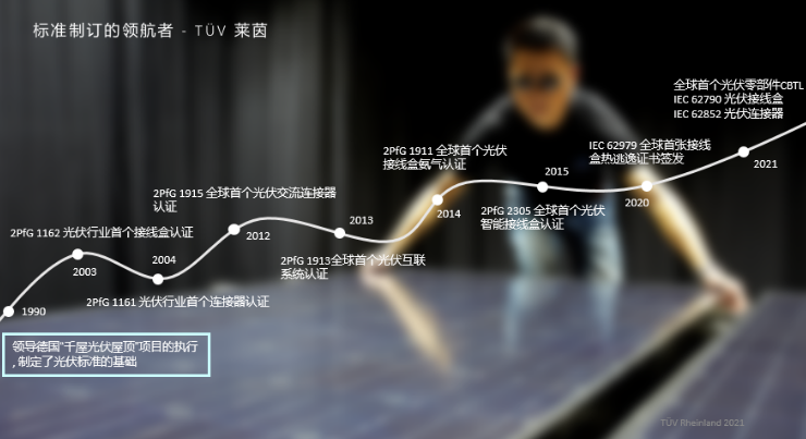 TÜV萊茵光伏零部件技術專家團隊通過與光伏企業及標委會的緊密合作,深耕數十載,基于自身多年的研究探索經驗,以及對長期試驗結果的分析,制定了多個光伏零部件相關的標準,包括光伏接線盒,光伏連接器,光伏線纜等,這些標準被全球范圍內的制造商和用戶廣泛認可和采納。TÜV萊茵以強大的技術實力和權威性為國內外光伏零部件企業進入全球市場提供檢測認證服務,在引領及規范行業發展的路上,取得了多項具有里程碑意義的時刻。