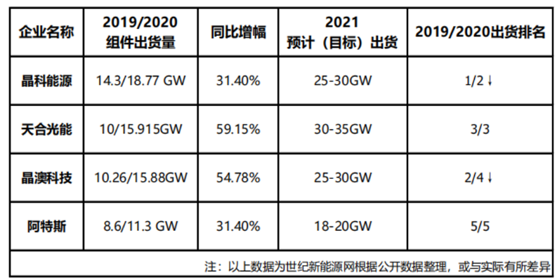 2021年,各家企業在2020年出貨量的基礎上相繼調高出貨目標。相關材料顯示:晶科在2021年預計(目標)出貨量為25-30GW,相較2020年增長33.2%-59.8%;天合預計(目標)出貨量30-35GW,相較2020年增長88.5%-119.95;晶澳預計(目標)出貨量25-30GW,相較2020年增長57.4%-88.9%;阿特斯預計(目標)出貨量18-20GW,相較2020年增長59.3%-77%。