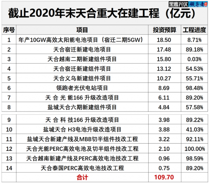 事實也確實如此,據黑鷹光伏統計,截止2020年末天合光能有14大在建工程,總投資預算達109.70億元,其中只有一個是“領跑者光伏電站項目”,其他全部是電池片及組件項目。