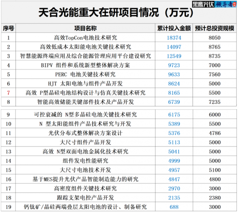另據黑鷹光伏統計,目前天合光能還擁有19個重大在研項目,涵蓋HJT、TopCon、BIPV、PERC、大尺寸電池及組件等等最具發展潛力的光伏技術,已累計投入資金13.56億元。