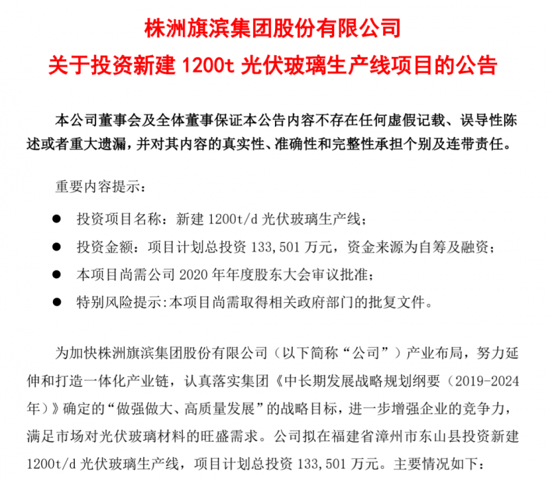 公告顯示,旗濱集團擬在福建省漳州市東山縣投資新建1200t/d 光伏玻璃生產線,項目計劃總投資133,501萬元。