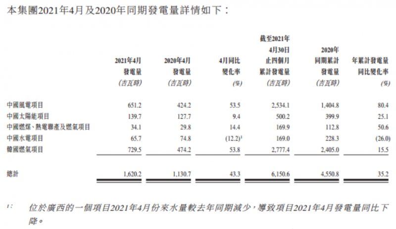 截至2021年4月30日止,1-4月,中廣核新能源累計完成發電量6,150.6吉瓦時,比2020年同期增加35.2%。其中,中國風電項目增加80.4%,中國太陽能項目增加25.1%。