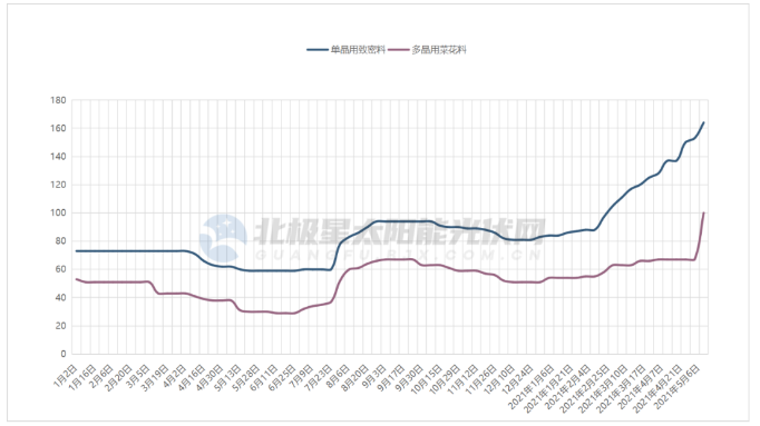 根據(jù)最新價格公示,本周單晶用致密料價格漲至164元/kg,較年初上漲98%,市場最高成交價甚至來到180元/kg,多晶用菜花料價格也達到100元/kg。