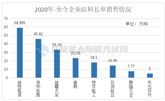 另一方面頭部企業(yè)的長單爆發(fā)加劇了市場的緊張情緒。據(jù)北極星太陽能光伏網(wǎng)統(tǒng)計信息,從2020年至今,未來3~5年的超200萬噸硅料已被長單鎖定。