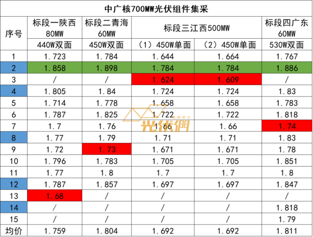 光伏們曾于《中核、中廣核5.7GW組件集采:雙面450瓦最高至1.898,590瓦均價1.74元/瓦》一文中,分析過中廣核700MW光伏組件集采開標情況,其中01標段報價均價1.759元/瓦,最高報價每瓦1.858元、最低報價每瓦1.68元。02標段報價均價1.804元/瓦,最高報價每瓦1.898元、最低報價每瓦1.73元。