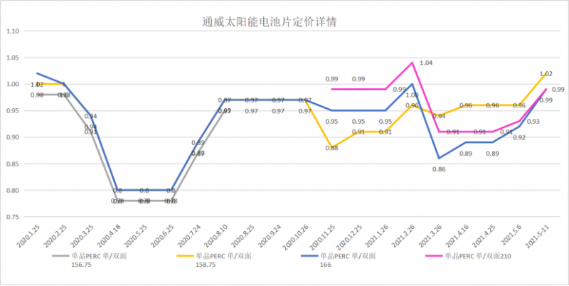 硅片方面,5月10日,中環股份全面提高了硅片報價,與此前4月27日(175/170μm厚度)的硅片報價相比,G12上漲0.6元,M6/G1上漲0.33元,漲幅分別為9%、8%與8.3%。電池片方面,繼5月6日通威股份宣布提高了電池片報價(除G1單晶之外),僅隔5天,通威電池片報價再次普漲6~7分/瓦。