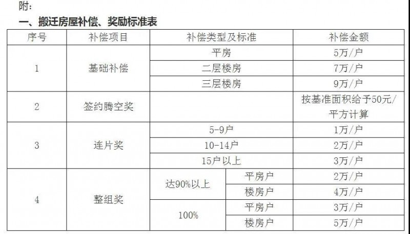 (3)整組獎:整個承包組全部搬遷的每主戶樓房獎5萬(平房獎3萬),90%以上搬遷的每主戶樓房獎4萬(平房獎2萬);如其他組個別戶穿插在另外一個組內,政策跟啟動組實施。