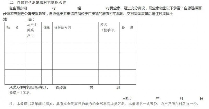符合搬遷和復墾標準,并納入年度搬遷計劃的,同時需簽訂自愿有償退出農村宅基地承諾書。