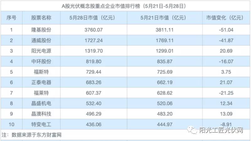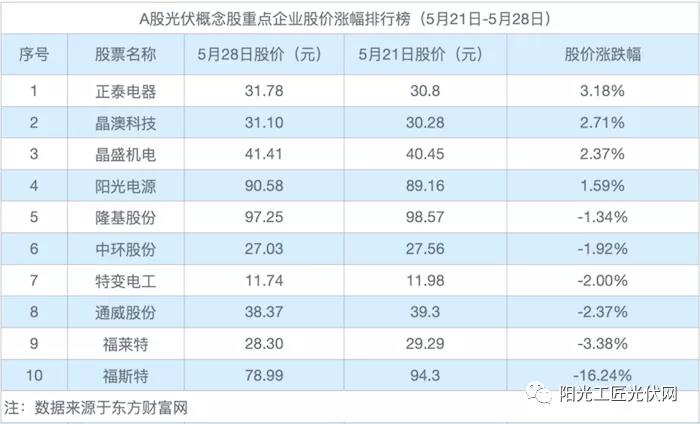 本周,10家光伏企業(yè)股價(jià)跌幅超5%僅福斯特1家,5月28日收盤報(bào)價(jià)對(duì)比上周跌16.24%。