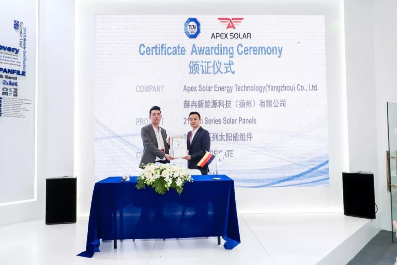 中國/上海 ,6月3日,在第十五屆(2021)國際太陽能光伏與智慧能源(上海)展覽會(huì)暨論壇期間, TÜV南德意志大中華集團(tuán)(以下簡(jiǎn)稱“TÜV 南德”)為赫冉新能源科技(揚(yáng)州)有限公司(以下簡(jiǎn)稱“赫冉新能源”)所展出的210單玻產(chǎn)品頒發(fā)TÜV 南德認(rèn)證證書。TÜV南德智慧能源高級(jí)運(yùn)營總監(jiān)以及首席簽證官張祝林、赫冉新能源董事長(zhǎng)陳建輝等一席嘉賓出席了該頒證儀式。