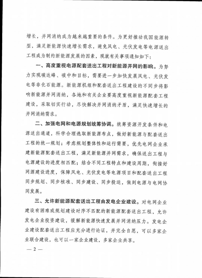 2)優(yōu)先電網(wǎng)企業(yè)承建新能源配套送出工程,保障風(fēng)電、光伏發(fā)電等電源項目和配套送出工程 同步規(guī)劃、同步核準(zhǔn)、同步建設(shè)、同步投運。