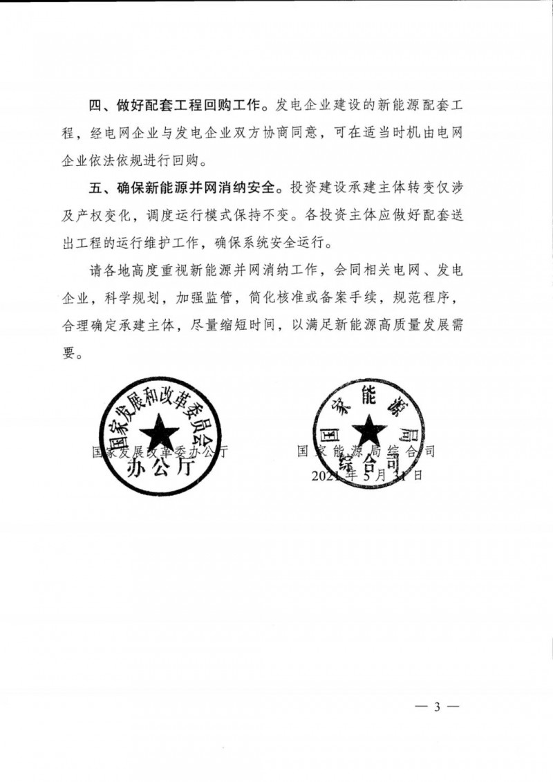 4)做好配套工程回購工作。發(fā)電企業(yè)建設(shè)的新能源配套工 程,經(jīng)電網(wǎng)企業(yè)與發(fā)電企業(yè)雙方協(xié)商同意,可在適當(dāng)時機由電網(wǎng) 企業(yè)依法依規(guī)進行回購。