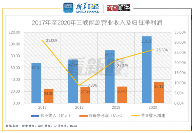 三峽能源主營業務為風能、太陽能的開發、投資和運營。2018年至2020年,公司實現營業收入分別為73.83億元、89.57億元、113.15億元,同比分別增加8.88%、21.32%、26.33%;實現歸母凈利潤分別為27.09億元、28.40億元、36.11億元,同比分別增加11.48%、4.84%、27.16%。