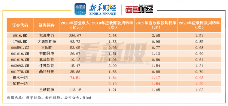 應收賬款規模較大的現象,在風電、光電行業較為普遍。根據三峽能源招股書中提到的龍源電力等7家上市公司列為可比公司(華能新能源已退市,不列入可比范圍),對其應收賬款周轉率進行統計如圖: