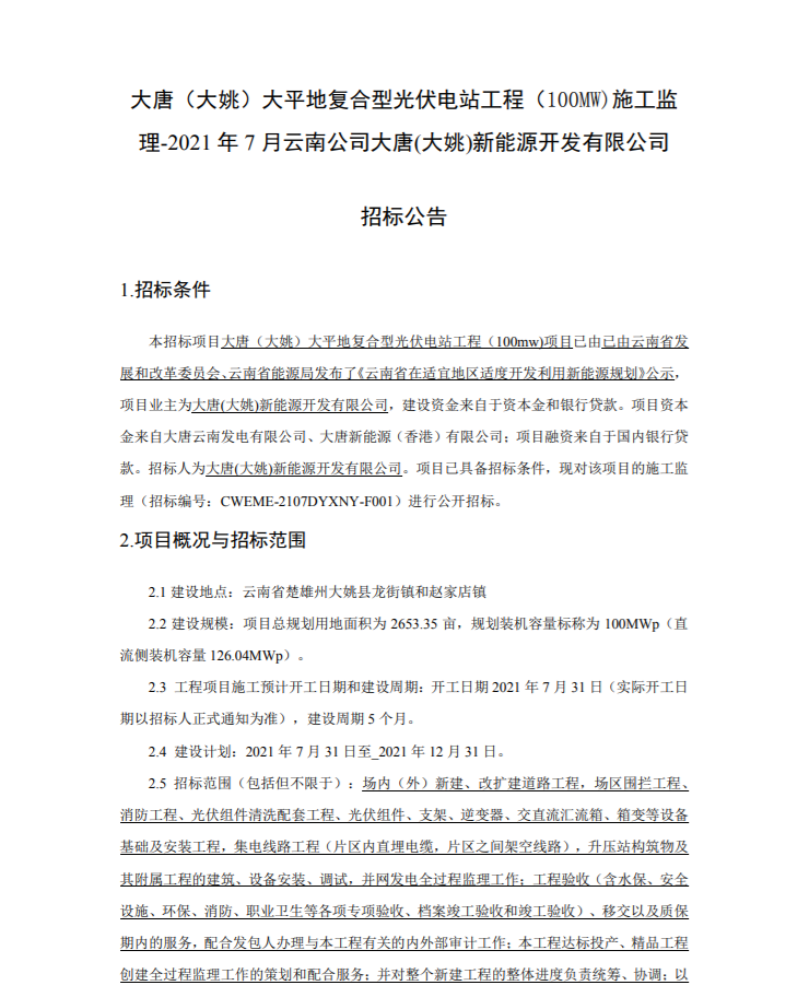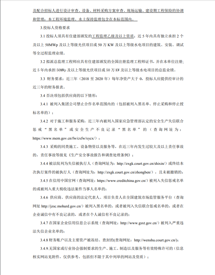 概況:場內(外)新建、改擴建道路工程,場區圍攔工程、消防工程、光伏組件清洗配套工程、光伏組件、支架、逆變器、交直流匯流箱、箱變等設備基礎及安裝工程,集電線路工程(片區內直埋電纜,片區之間架空線路),升壓站構筑物及其附屬工程的建筑、設備安裝、調試,并網發電全過程監理工作;工程驗收(含水保、安全設施、環保、消防、職業衛生等各項專項驗收、檔案竣工驗收和竣工驗收)、移交以及質保期內的服務,配合發包人辦理與本工程有關的內外部審計工作;本工程達標投產、精品工程創建全過程監理工作的策劃和配合服務;并對整個新建工程的整體進度負責統籌、協調;以及配合招標人進行設計審查、設備、材料采購方案審查、現場運輸、建設期工程保險的協調和管理;本工程環境監理、水土保持監理包含在本標范圍內。