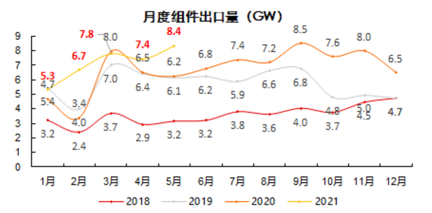 5月光伏組件出口8.36GW,環比增長12.71%,同比增長33.9%;出口金額環比增長12%,同比增長37.7%,逆變器出口金額為21.96億元(人民幣),同比增長37.8%,依舊維持高位,海外市場需求和景氣度超預期。