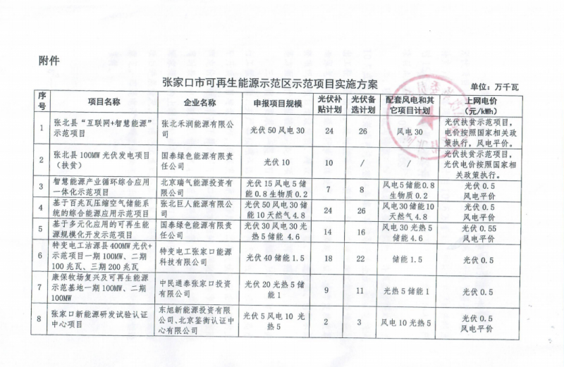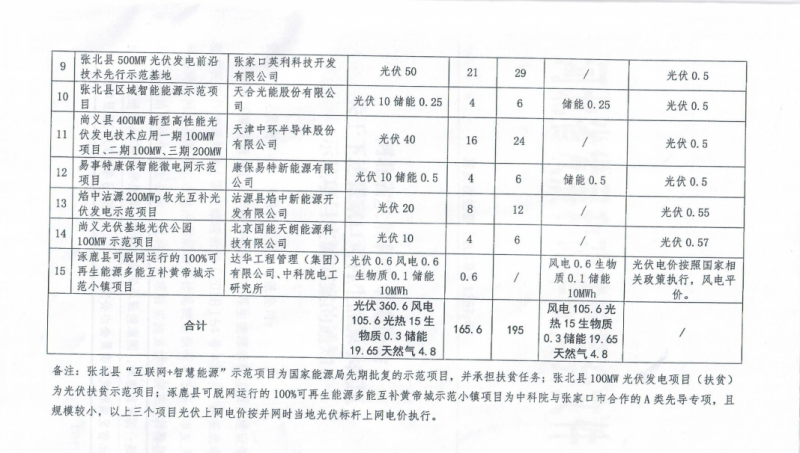 據過往資料查詢,2018年10月,《張家口可再生能源示范區示范項目實施方案》印發,共安排15個項目,光伏發電規模為3.606GW,有補貼計劃為1.656GW,備選規模為1.95GW;配套風電1.056GW、儲能項目196.5MW以及其他光熱、生物質項目等。