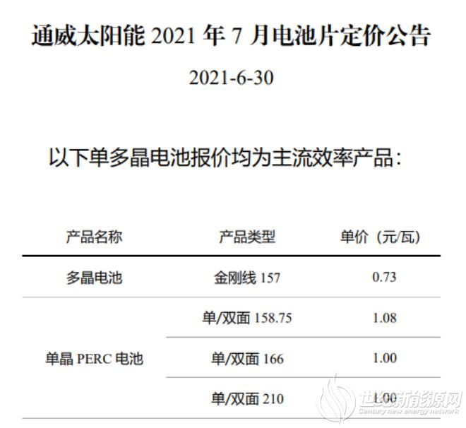 6月30日,在經歷七連漲后,通威電池片價格終于迎來拐點。根據通威7月電池片電價公告,多晶157電池報價為0.73元/W,下調0.13元;單晶PERC 158.75電池價格1.08元/W,下調0.02元;單晶PERC 166電池報1.00元/W,下調0.08元;單晶PERC 210電池定價為1.00元/W,下調0.08元。