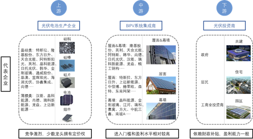 目前,我國BIPV產業鏈已經形成上游光伏電池生產,中游系統集成以及下游包括包括政府、居民、工商業用戶等投資商的產業鏈體系。