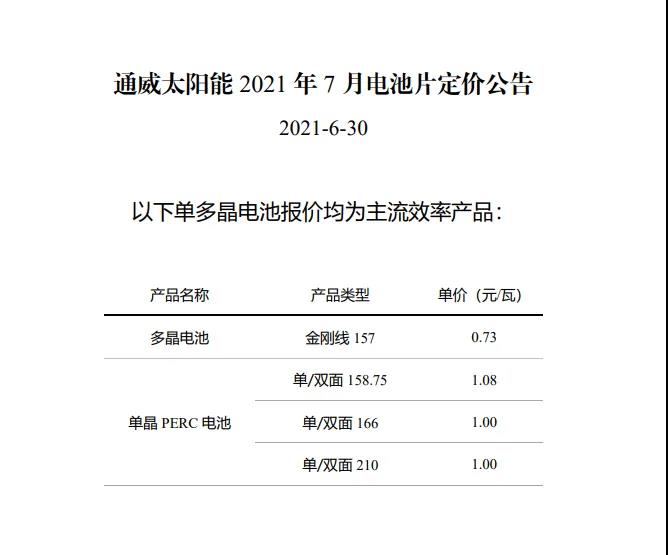 據(jù)最新報(bào)價(jià)顯示,多晶157電池報(bào)價(jià)為0.73元/W,下調(diào)0.13元;單晶PERC 158.75電池價(jià)格1.08元/W,下調(diào)0.02元;單晶PERC 166電池報(bào)1.00元/W,下調(diào)0.08元;單晶PERC 210電池定價(jià)為1.00元/W,下調(diào)0.08元。