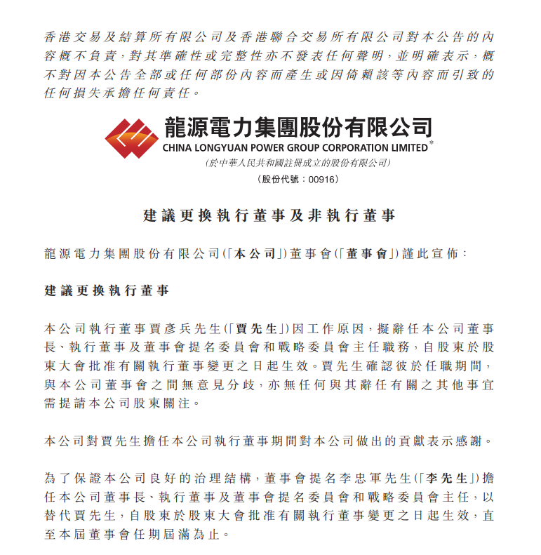 公告稱公司執(zhí)行董事賈彥兵因工作原因,擬辭任公司董事長、執(zhí)行董事及董事會提名委員會和戰(zhàn)略委員會主任職務(wù),自股東于股東大會批準(zhǔn)有關(guān)執(zhí)行董事變更之日起生效。