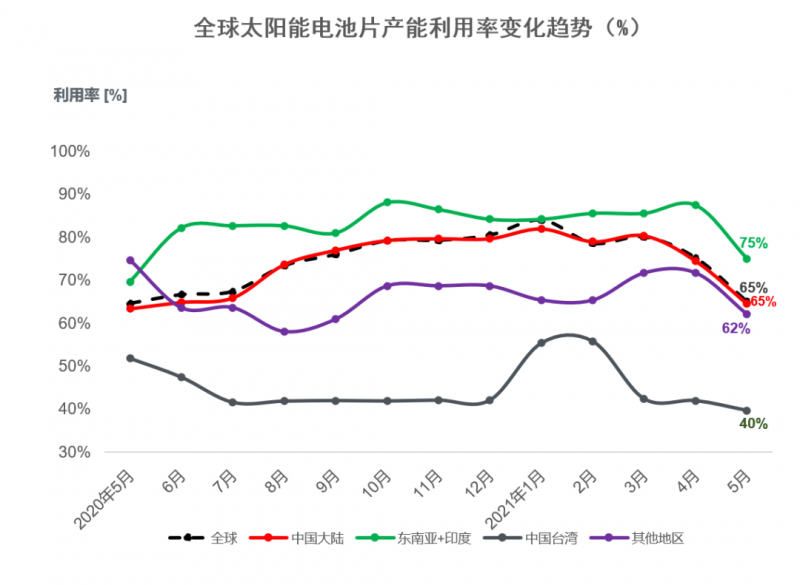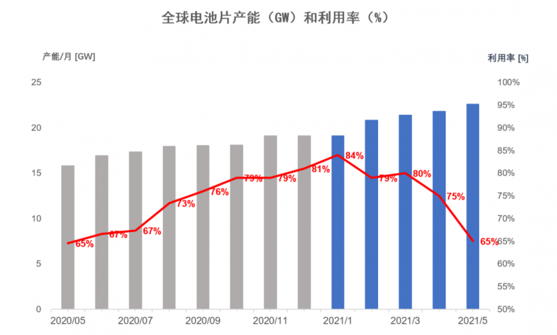 2021年5月,由于硅片緊缺、開工率不足、終端需求疲軟等因素,全球太陽能電池片產(chǎn)能利用率進(jìn)一步下降,目前產(chǎn)能利用率保持在65%左右。