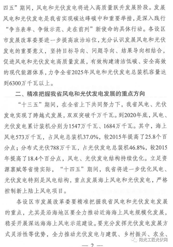 2020年以來,習近平總書記對碳達峰碳中和作出了一系列重要講話和重要指示,明確2030年風電和太陽能發電總裝機容量達到12億千瓦以上,對風電和光伏發電提出了新目標和新任務。“十四五”期間,風電和光伏發電將進入高質量躍升發展階段。發展風電和光伏發電是我省實現碳達峰碳中和重要舉措,是深入踐行“爭當表率、爭做示范、走在前列”新使命的具體行動。各設區市發展改革委要進一步提高政治站位,充分認識發展風電和光伏發電的重要意義,堅持目標導向、問題導向、結果導向相結合,促進風電和光伏發電高質量發展,有效構建清潔低碳、安全高效的現代能源體系,力爭全省2025年風電和光伏發電總裝機容量達到6300萬千瓦以上。