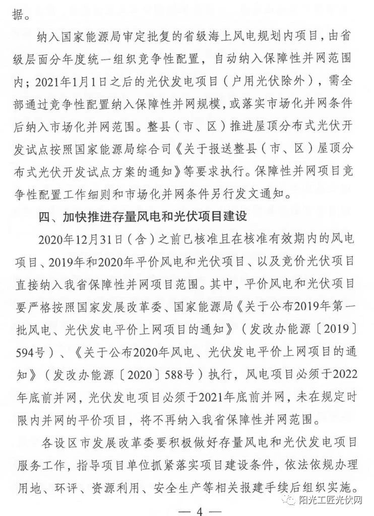 2020年12月31日(含)之前已核準且在核準有效期內的風電項目、2019年和2020年平價風電和光伏項目、以及競價光伏項目直接納入我省保障性并網項目范圍。其中,平價風電和光伏項目要嚴格按照國家發展改革委、國家能源局《關于公布2019年第一批風電、光伏發電平價上網項目的通知》(發改辦能源〔2019〕594號)、《關于公布2020年風電、光伏發電平價上網項目的通知》(發改辦能源〔2020〕588號)執行,風電項目必須于2022年底前并網,光伏發電項目必須于2021年底前并網,未在規定時限內并網的平價項目,將不再納入我省保障性并網范圍。