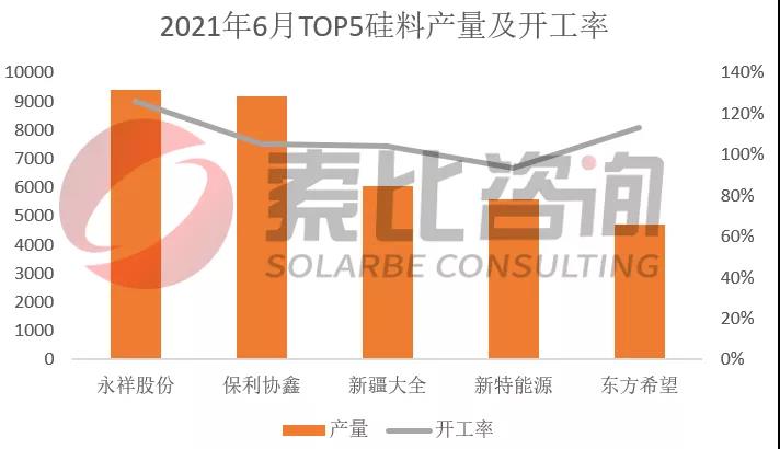 繼2020年4月份硅料產量歷史新高后,2021年6月份硅料產量再創新高,產量4萬噸(約14GW),環比增長3.5%,主要系永祥檢修產能優化導致。TOP5產量總計3.5萬噸,占比87.2%,綜合開工率108.2%。