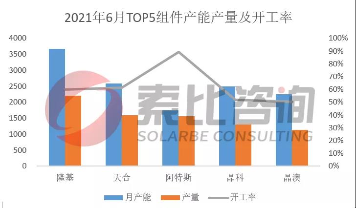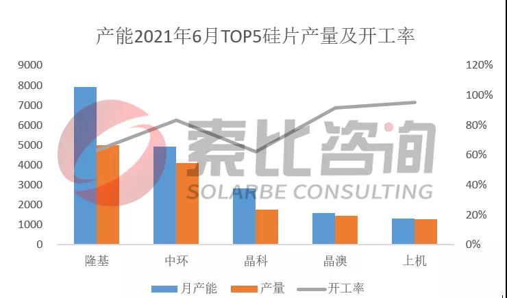 2021年6月份硅片產量17.73GW,環比下降5%。產量TOP5排序為隆基、中環、晶科、晶澳、上機,總計13.6GW,占比76.6%,綜合開工率79.1%。