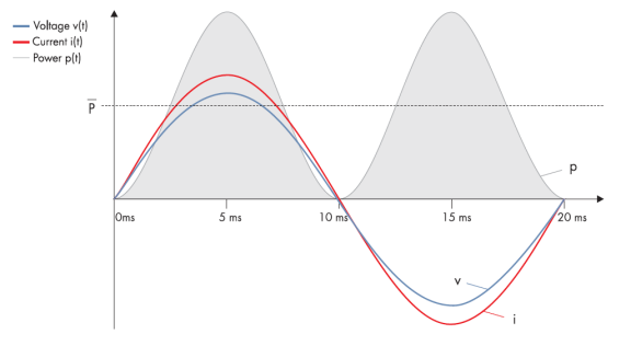 圖一: 100%有功功率正弦波圖: 當電壓及電流在同一瞬間增加及減少,產生的功率(灰色區塊)在0 – 100% 波動,時間拉長后平均下來成為P (W) 值