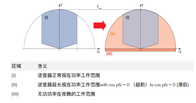 如上圖第三區塊顯示, SMA的逆變器最多可提供100%無功功率給電網。但在白天時如果操作提供過多無功功率, 將會導致輸出有功功率大幅減少,如上圖第二區塊顯示。在夜晚時提供此功能意味著當無功功率為100%時,也不影響白天有功功率的發電量, 減少業主收益損失。