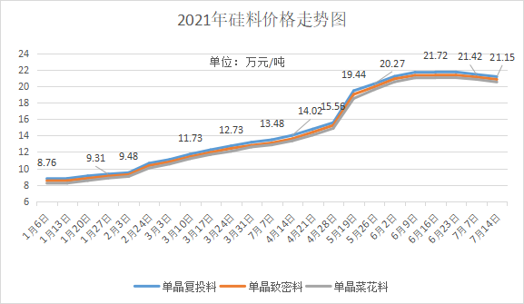 這是自2021年7月7日多晶硅價格首次下跌后,市場連續兩周報價走低。據硅業分會分析,需求方面,6月下旬京運通、高景、弘元等硅片新產能陸續建成投產,從三季度開始對硅料的需求將有較大支撐。供應方面,8月份將有四家萬噸級硅料企業計劃檢修,產量環比大幅減少。因此,雖然三季度或因現有硅片企業開工率或者價格下調,多晶硅企業為讓利下游而呈現硅料價格下跌的走勢,但需求增加、供應減少的市場基本面會從根本上支撐多晶硅價格有限的下跌幅度。