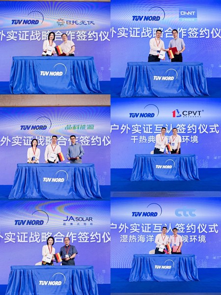 TUV北德分別與江蘇日托光伏科技股份有限公司、晶澳太陽能科技股份有限公司、晶科能源股份有限公司、浙江正泰新能源開發有限公司簽署了戶外實證戰略合作協議。