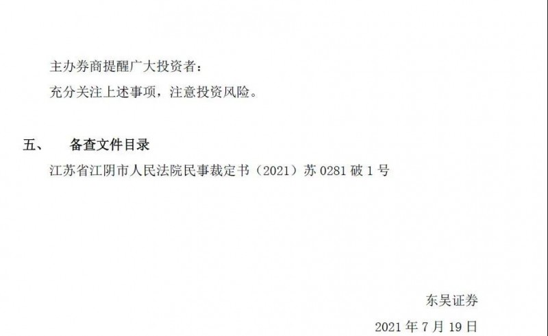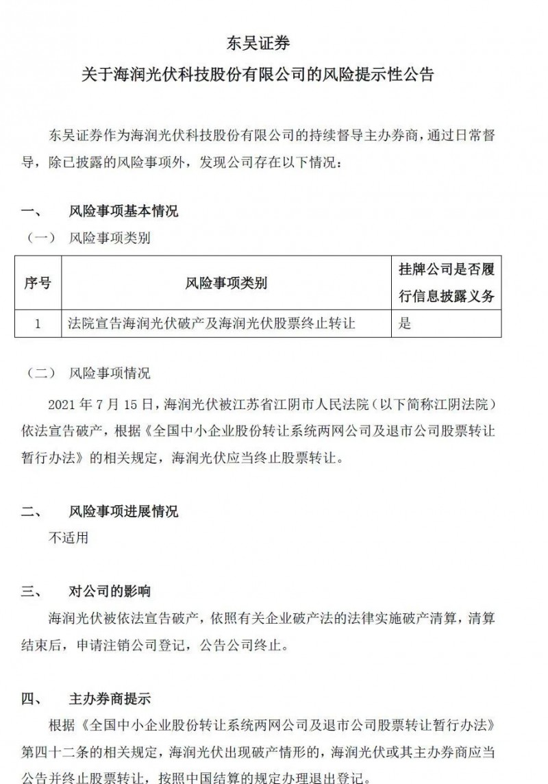 7月19日,海潤公告宣布,公司于2021年7月15日被江陰市人民法院依法宣告破產,依照有關企業破產法的法律實施破產清算,清算結束后,申請注銷公司登記,公告公司終止。