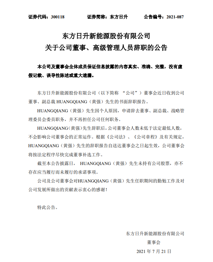 7月21日,東方日升發布關于公司董事、高級管理人員辭職的公告。
