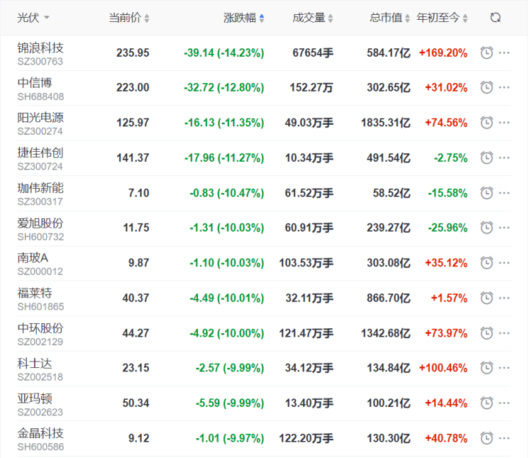 作為資本市場重要板塊,光伏行業很難置身事外,超80%光伏概念股今日出現下跌,電氣設備板塊整體跌幅5.79%。具體看,愛旭股份、南玻A、福萊特、中環股份、科士達、亞瑪頓、金晶科技等7只股票跌停,錦浪科技、中信博、陽光電源、捷佳偉創、珈偉新能等5只身處創業板、科創板的股票跌幅超過10%,超30只股票跌幅超過5%,就連光伏ETF(SH:515790)也罕見地出現6.98%下跌。