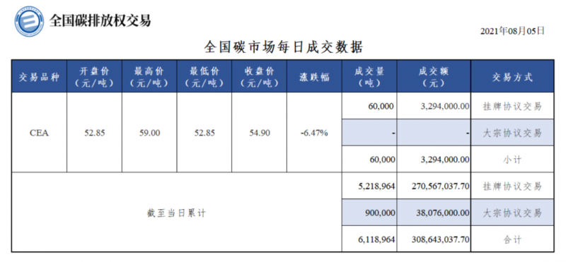 截至今日,全國碳市場碳排放配額(CEA)累計成交量6,118,964噸,累計成交額308,643,037.70元。