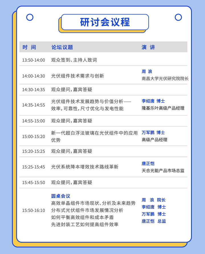 針對線下熱門的光伏組件相關專題,除嘉賓們的演講主題之外,本次大會特別增加圓桌會議形式,將會針對觀眾提出的各個問題逐一進行討論交流。