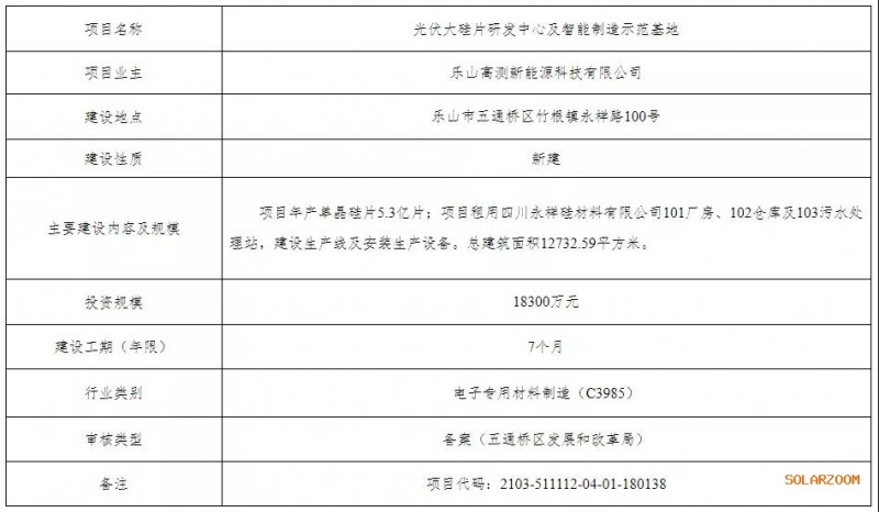 據了解,光伏大硅片研發中心及智能制造示范基地項目業主為樂山高測新能源科技有限公司,項目位于樂山市五通橋區竹根鎮永祥路100號。該項目年產單晶硅片5.3億片;項目租用四川永祥硅材料有限公司101廠房、102倉庫及103污水處理站,建設生產線及安裝生產設備??偨ㄖ娣e12732.59平方米。該投資規模為18300萬元,建設工期為7個月。